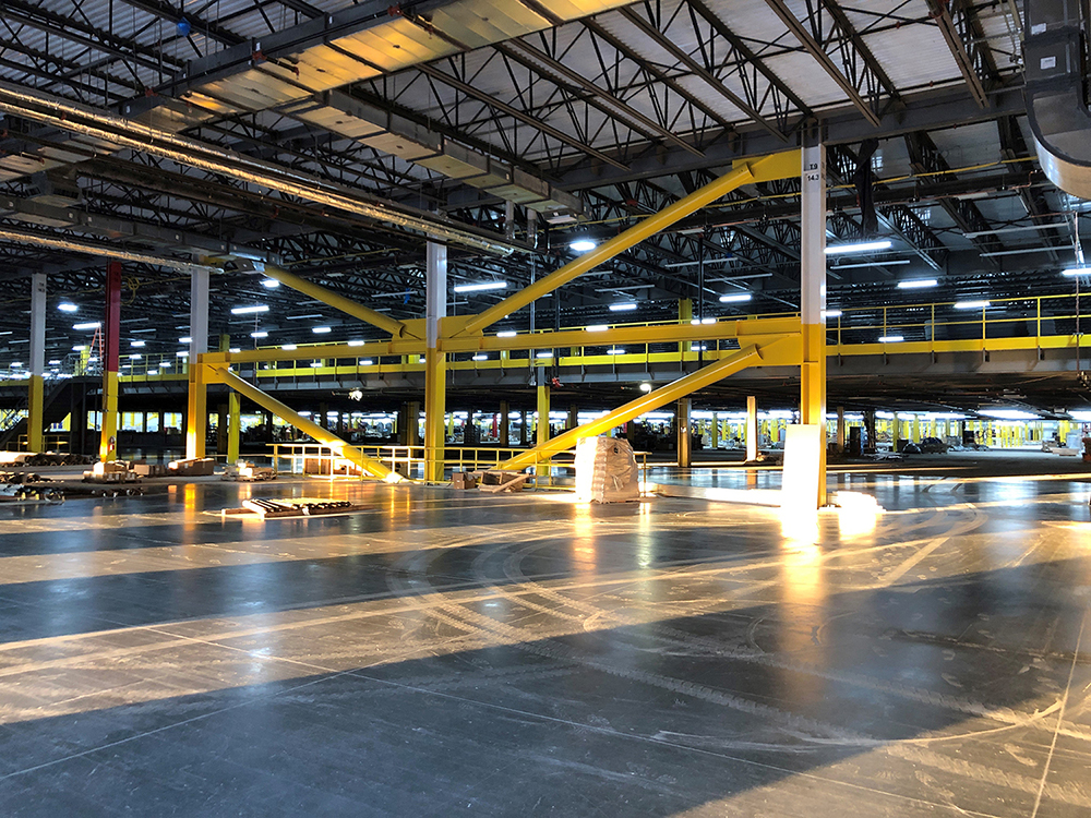 A large, structural steel-frame, e-commerce sortation and fulfillment facility that includes an insulated tilt-wall panel skin and five levels of slab-on-metal deck to support robotic sortation. More than 60 dock levelers and three dock-high ramps to keep goods moving. The site consists of 823,400 square feet of 8-inch thick slab-on-grade, 2.93 million square foot slab-on metal deck, 152,000 square feet of tilt-up panels and 1.34 million square feet of site paving.