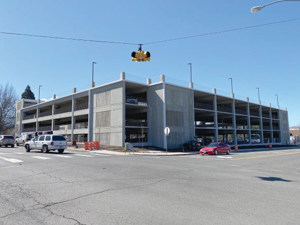 This four-level, cast-in-place, post-tension parking garage has a footprint of just 48,500 square feet but provides more than 188,000 square feet for parking. The project required just under 6,600 cubic yards of concrete.