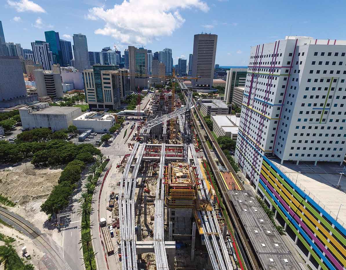 All Aboard Florida is part of the first phase of the Brightline express train service, connecting and transporting passengers from Miami to Ft. Lauderdale to West Palm. Baker plays a large role in the 9 acre project being contracted to build both the station and the Elevated Rail. The Station will connect to the Brightline with the Metrorail and Metromover and this portion of the work included the construction of over 200 pile foundations, including 3 large foundation mats for the overbuild towers. The Elevated Rail consists of 3 train track decks, where Baker’s scope included the foundations, columns and caps elevated 50 feet above the street, as well as the erection of the “I” Beams, which attached to various hammerhead columns and straddle bent beams to support a high speed train traveling at 80mph. This project was completed by our Fort Lauderdale and Miami, Florida, team.