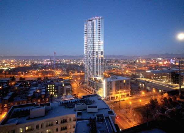 The Confluence is a residential high rise in downtown Denver. The structure includes three levels of below-grade parking, 25 floors of luxury one- and two-bedroom apartments, and nine levels of penthouse units. A pool deck on the fifth level connects a six-story counterpart with the main tower.